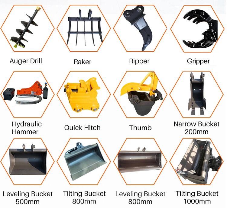 TuoHong Bagger ist für kleine Arbeiten, kleine Projekte, im Garten, Ackerland, kommunale Arbeiten, Gemüsegewächshaus, Graben Graben konzipiert. Es ist mit kleinem Motor, einfachem Design, einfach zu warten. Verwenden Sie unsere Schnellwechsler (Schnellspanner) kann die Anbauwerkzeuge wie hinzufügen: Bohrerschnecke, Hydraulikhammer, Anhänger, 20cm – 100cm Eimer, Rechen, Greifer, Holzgreifer und so weiter.