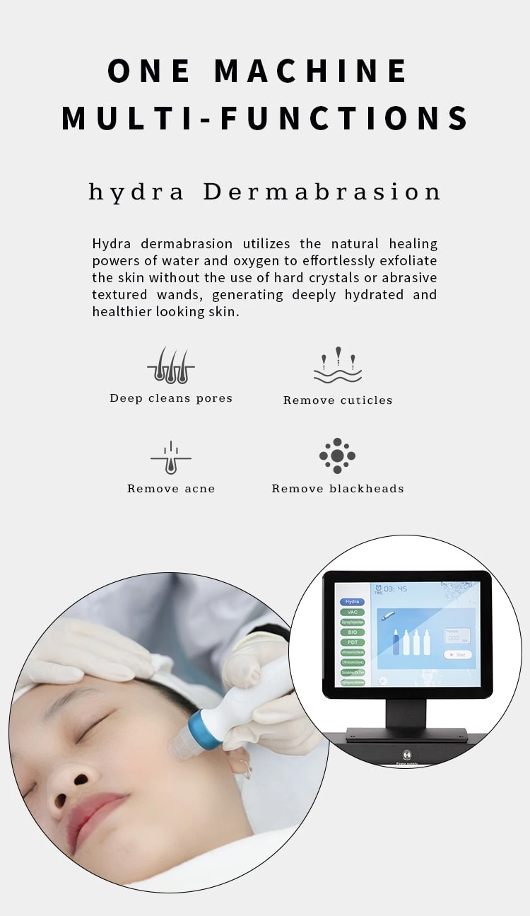 Die einzigartige Hydra-Dermabrasionsspitze strahlt einen dünnen und winzigen Wasserstrahl aus und poliert die Haut in hoher Geschwindigkeit durch Vakuumabsaugung, die Flüssigkeit, aus der die Haut in der Zwischenzeit Feuchtigkeit spendet.